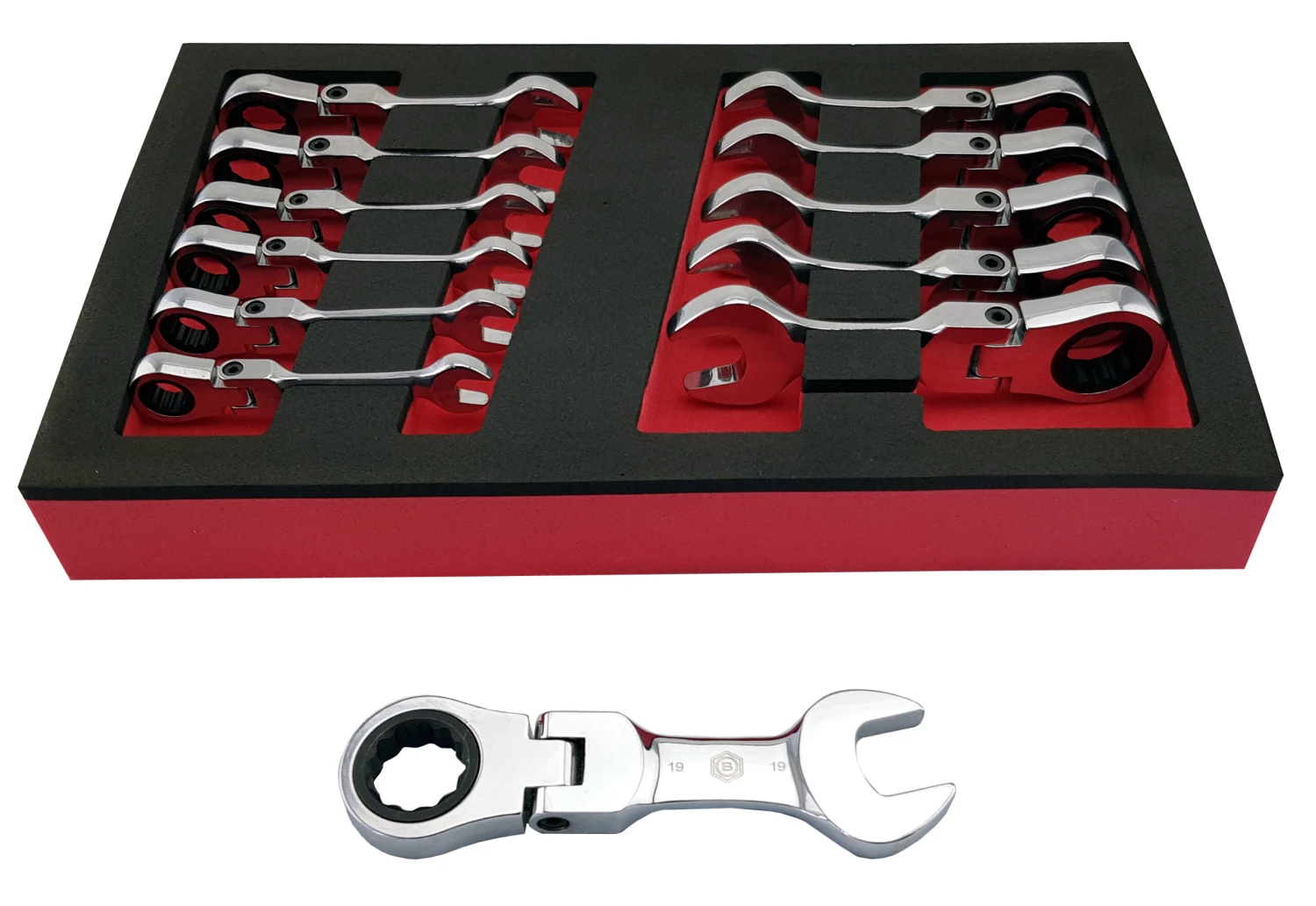 - Britool Hallmark 12 piece Stubby (Short) Flexible Ratchet Combination Spanner Set in a Foam Tray.