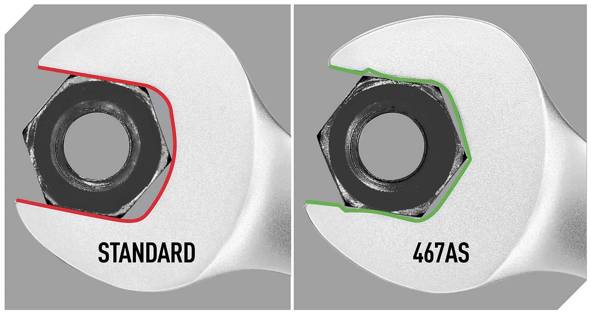- Special hooks integrated in the 467AS open end “lock” with fastener head edges reducing the risk of slipping >> the open end does not slip off the fastener head.