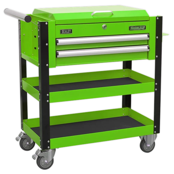 - Garage or workshop trolley with two shelves and a lockable gas sprung supported lid, which allows for items to be kept safe when not in use.
