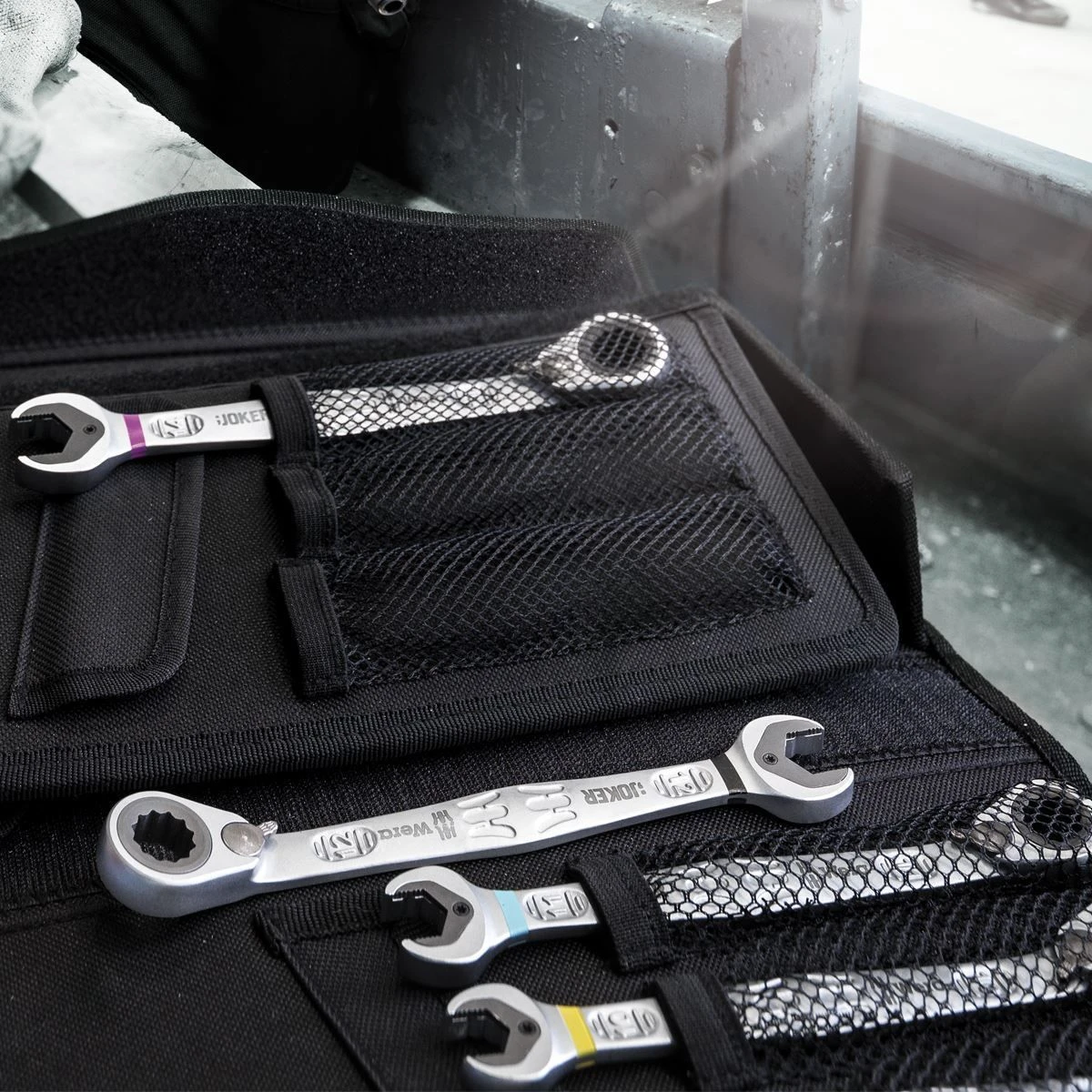 The Joker performs fastening jobs in almost every conceivable situation, quickly and with great precision. The ratcheting feature at the ring end boasts an exceptional, fine-tooth mechanism (80 teeth!) which provides greater flexibility, even in very confined working spaces. The specially forged geometry, in combination with high-performance chrome-molybdenum steel and nickel-chrome coating, means that you win three times over: longer service life, high resistance to wear and great protection against corrosion