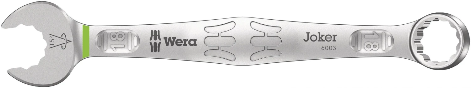 - For very tight spaces – The Joker 6003 ring spanner with its special mouth geometry – a mouth side pivoted by 7.5° and the double hexagon geometry – doubles the placement possibilities when repeatedly turning the wrench 180° around the longitudinal axis. Bolts and screw heads can be “taken“ every 15°. The Joker 6003 will automatically find the respective placement point after every turn.
